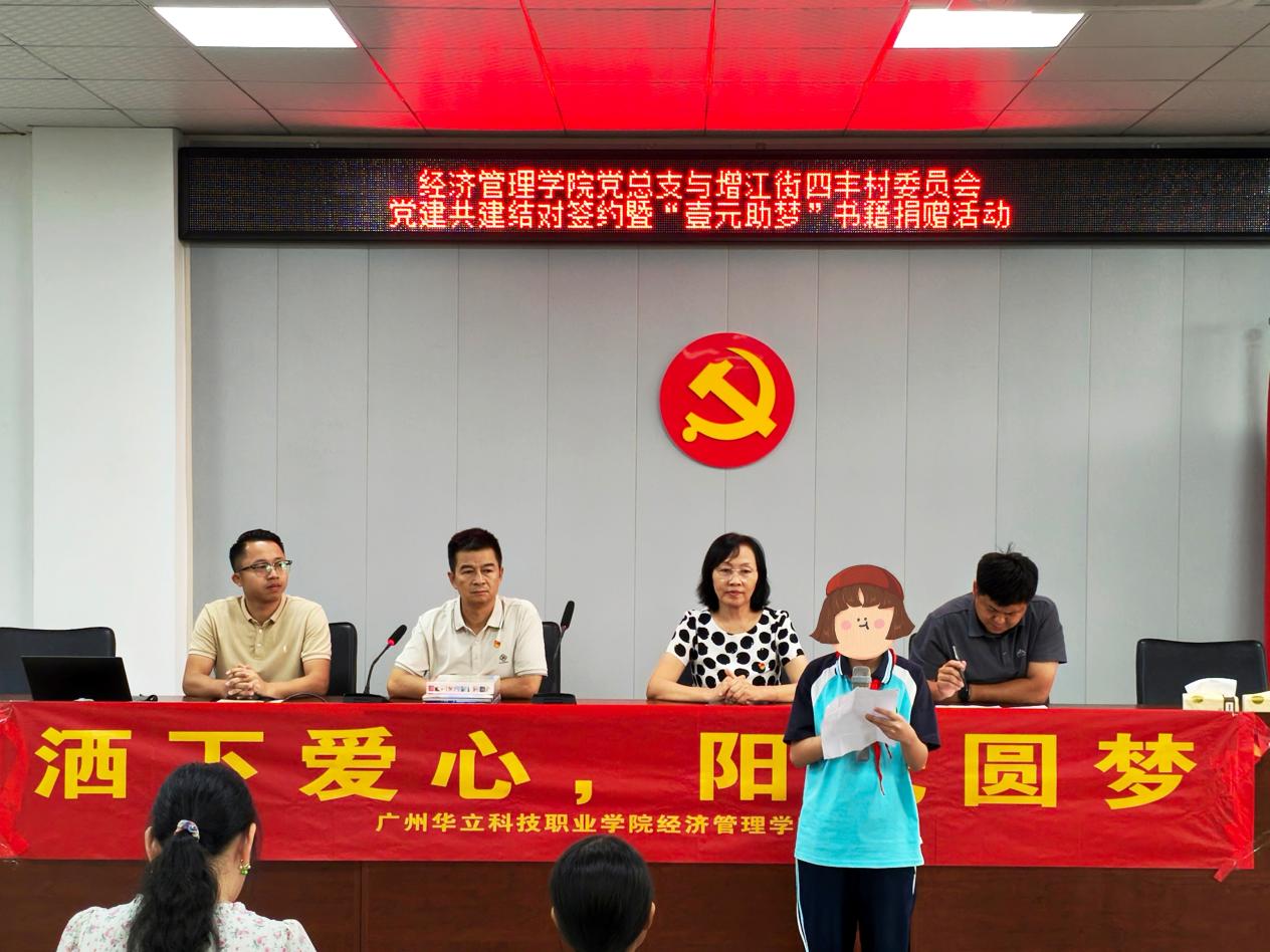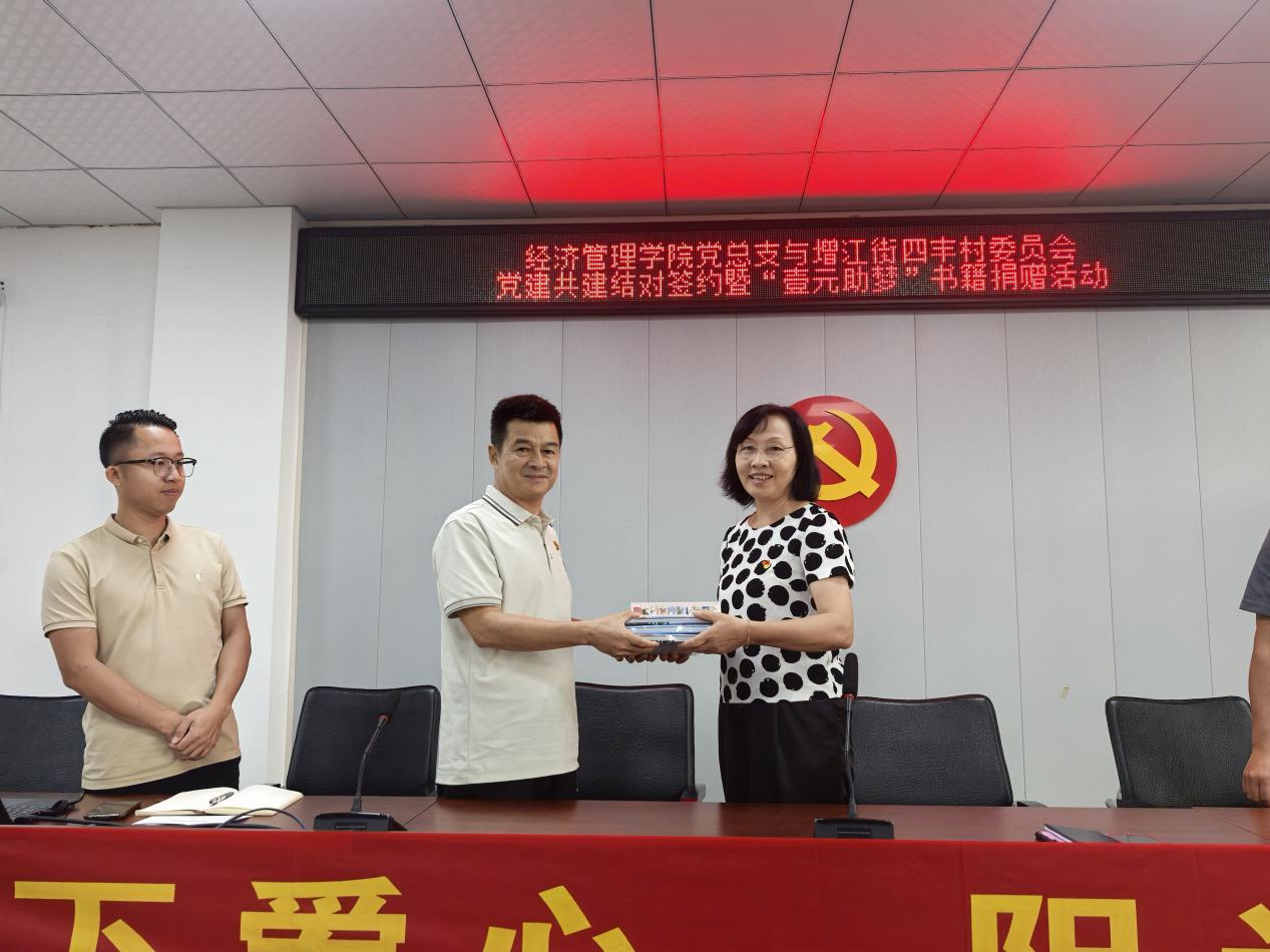 為弘揚(yáng)奉獻(xiàn)精神,傳遞知識(shí)力量,助力夢(mèng)想起航,6月30日,經(jīng)濟(jì)管理學(xué)院黨總支在四豐村黨群服務(wù)中心開(kāi)展“壹元助夢(mèng)”愛(ài)心書(shū)籍捐贈(zèng)活動(dòng)。經(jīng)濟(jì)管理學(xué)院黨總支書(shū)記、院長(zhǎng)劉惠玲,副院長(zhǎng)朱向平,四豐村黨支部書(shū)記陳耀堅(jiān)、四豐小學(xué)校長(zhǎng)陳遠(yuǎn)球及村民代表、師生代表共同出席了活動(dòng)。