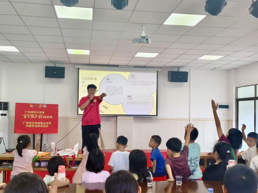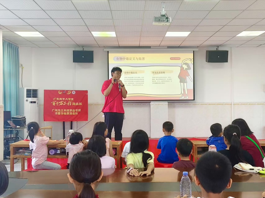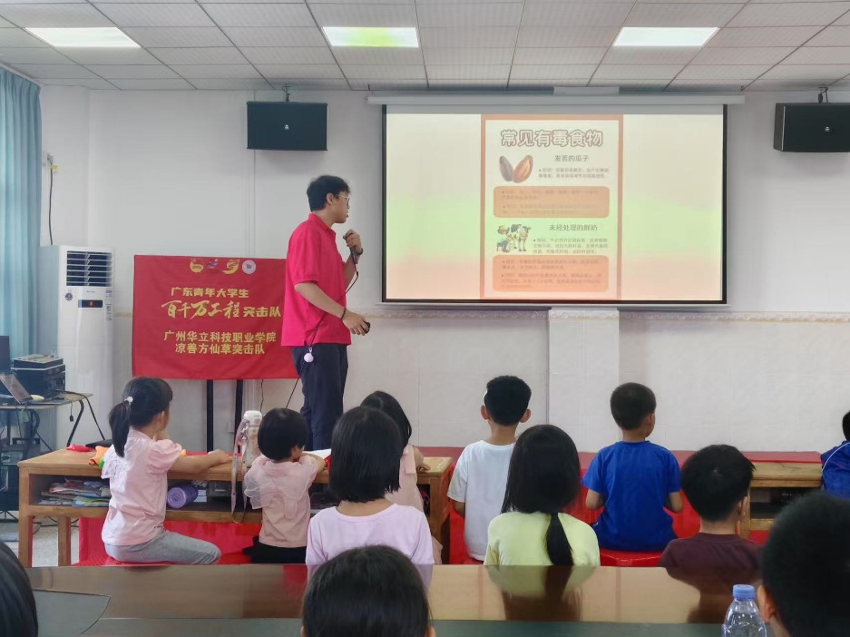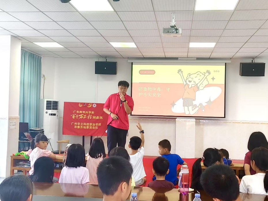 為提升食品安全意識,有效防范食物中毒風(fēng)險,2025年7月15日下午,廣州華立科技職業(yè)學(xué)院經(jīng)濟(jì)管理學(xué)院涼善方仙草突擊隊(duì)在廣州市增城區(qū)陸村村為當(dāng)?shù)氐暮⒆娱_展預(yù)防食物中毒主題宣傳教育活動。
