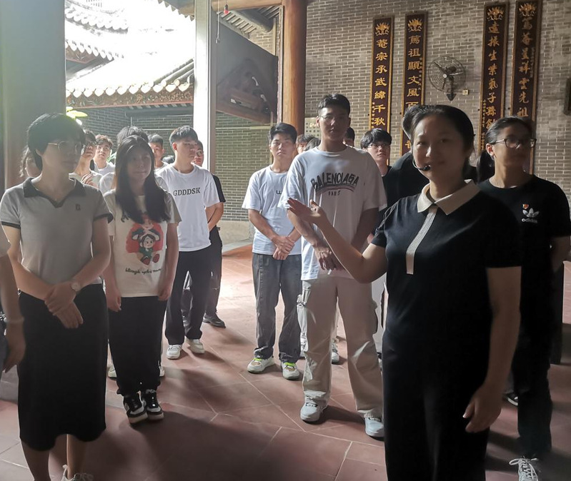 在這堂特殊的思政課中,學(xué)生們跟隨老師的步伐,一同走進(jìn)位于增城新塘鎮(zhèn)群星村的篤菴湛公祠。經(jīng)湛氏后裔湛偉健先生的介紹,湛篤菴是新塘湛氏二世祖,其父湛露為新塘湛氏的開宗始祖,其弟湛晚丁的六世孫即為湛若水。篤菴湛公祠見證了湛氏家族的歷史變遷,也承載著湛若水先生的精神遺產(chǎn)。在祠堂內(nèi),學(xué)生們認(rèn)真聆聽湛偉健先生講述湛氏家族的歷史故事,了解了新塘湛氏的起源、二世祖篤菴公的事跡,以及三世祖湛懷德保衛(wèi)鄉(xiāng)民、平息叛亂的忠義之事。隨后,另一位湛氏后裔湛柏欣先生則講述湛若水的生平事跡,了解他一生為學(xué)、為官的堅(jiān)韌與執(zhí)著。