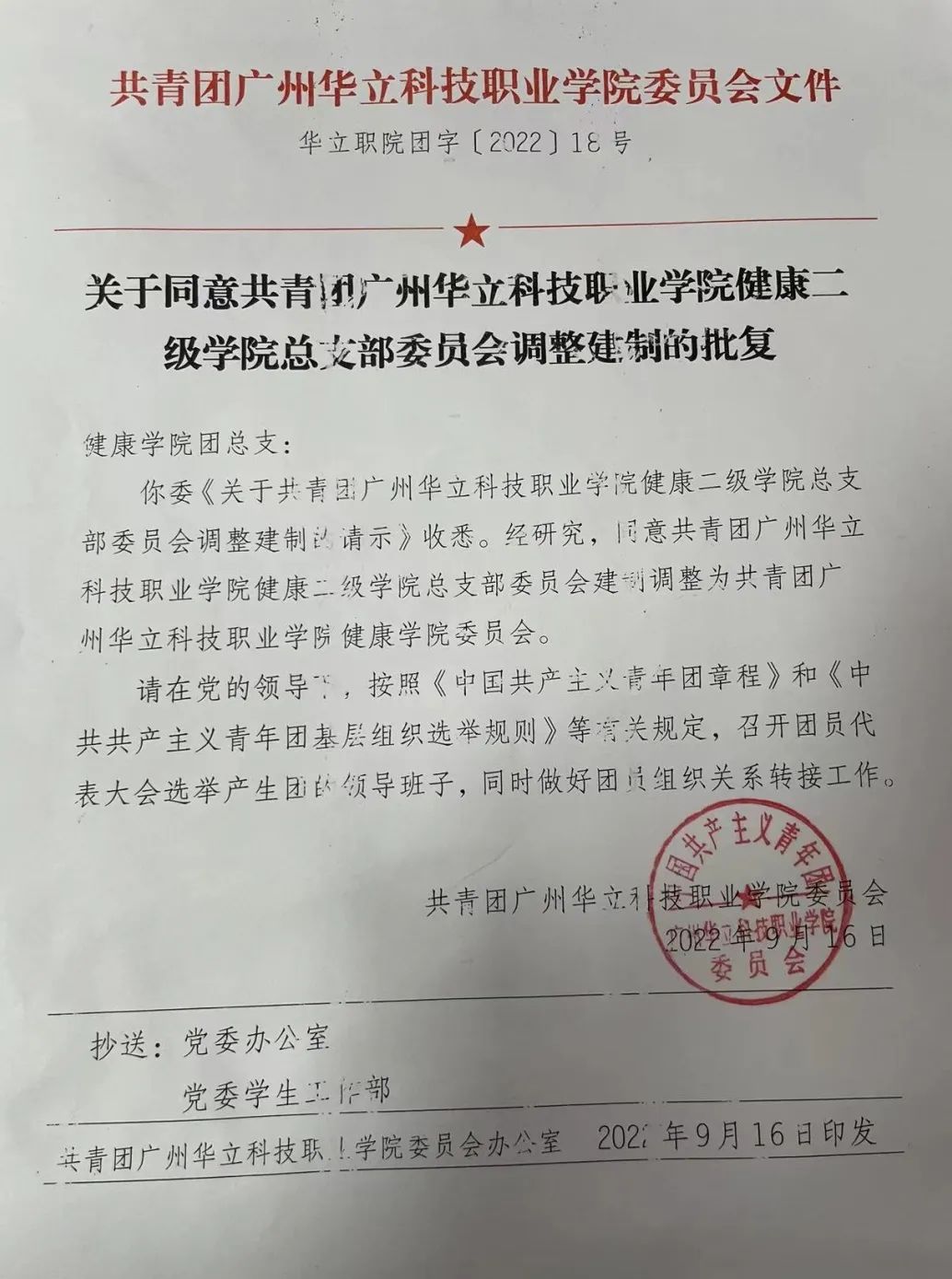 《關(guān)于同意共青團(tuán)廣州華立科技職業(yè)學(xué)院健康二級(jí)學(xué)院總支部委員會(huì)調(diào)整建制的批復(fù)》