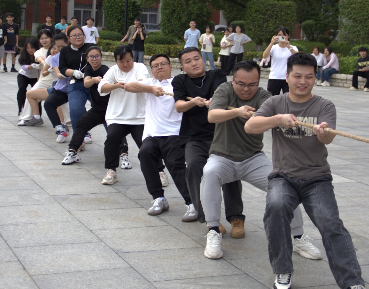 教師代表隊(duì)以學(xué)院為單位抽簽進(jìn)行分組,組成了一支支斗志昂揚(yáng)的參賽隊(duì)伍與學(xué)生進(jìn)行了師生友誼賽。比賽開始前,各隊(duì)員進(jìn)行了充分的熱身運(yùn)動,摩拳擦掌,蓄勢待發(fā)。隨著裁判的一聲哨響,比賽正式拉開帷幕。他們緊握長繩,咬緊牙關(guān),全力以赴地往后拉。觀眾們則在一旁吶喊助威,加油聲此起彼伏,為比賽增添了濃厚的氛圍。