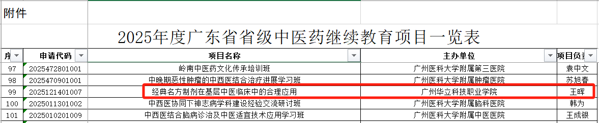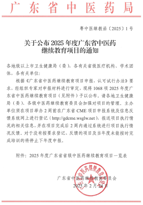 2025年2月25日,由潘菽弢博士起草申報的《經(jīng)典名方制劑在基層中醫(yī)臨床中的合理應用》成功入選2025年廣東省中醫(yī)藥繼續(xù)教育項目(CME)。這是我校首次獲得此類繼續(xù)教育項目舉辦資格。