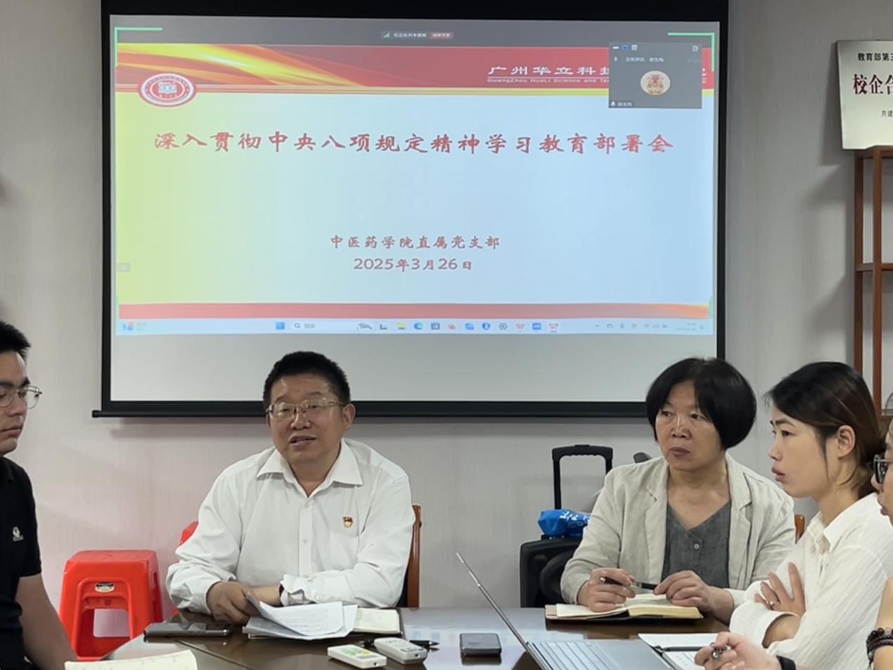 為持續(xù)深化全面從嚴治黨,切實增強黨員紀律意識和規(guī)矩意識,3月26日上午,中醫(yī)藥學院直屬黨支部組織召開全體師生黨員大會,專題部署深入貫徹中央八項規(guī)定精神學習教育工作。會議由黨支部書記曾祥彪同志主持,校外實習學生黨員線上參會。