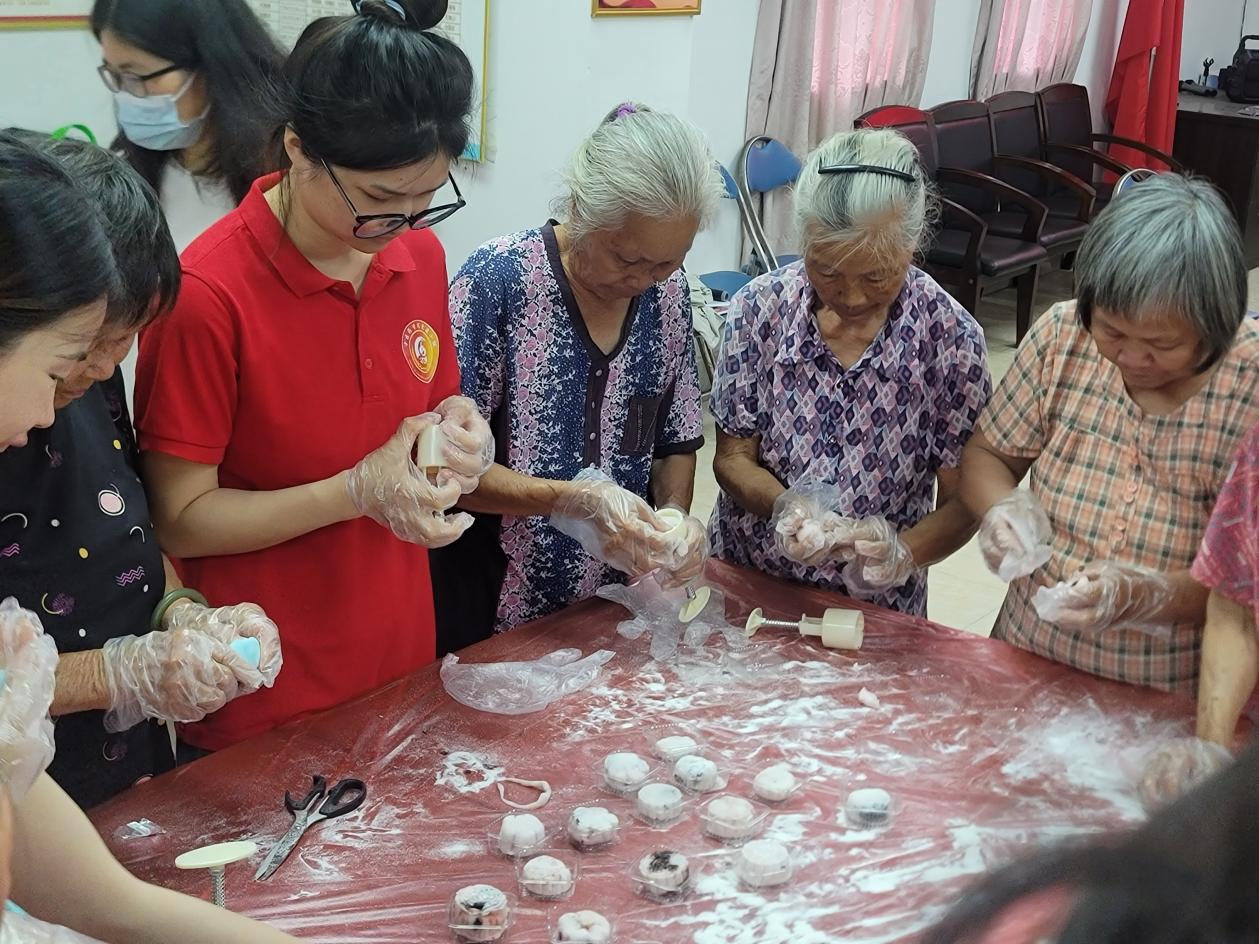 在練習(xí)完八段錦后,志愿者們與長者們共同投入到冰皮糕點的制作中。大家圍在一起,揉面團、稱克重、包餡料、壓模具……大家分工協(xié)作,笑聲不斷,一個個造型精致的糕點逐漸成型。活動最后,工作人員為長者們獻上歌曲,長者們共同品味親手制作的糕點。