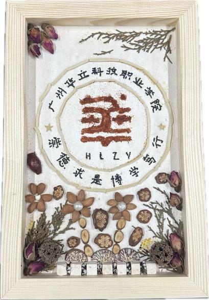 參賽作品主題豐富,風(fēng)格多樣,充分展現(xiàn)了中醫(yī)藥學(xué)子的奇思妙想和深厚文化底蘊(yùn)。24中藥3班林思琪團(tuán)隊作品摘得一等獎,他們以校徽為靈感,用各色藥材精心拼貼出一幅色彩斑斕的校徽圖案,不僅精準(zhǔn)還原了?;盏妮喞c細(xì)節(jié),紅花拼成的紅潤“華”字更象征著學(xué)校蓬勃的生命力。