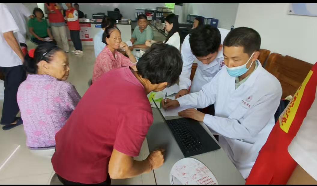 盡管如此,“肘后丹心”突擊隊(duì)為全面了解廣東鄉(xiāng)村居民真實(shí)健康狀況,仍然決定來(lái)到此村。當(dāng)團(tuán)隊(duì)在沙上村委會(huì)門口走下車門,發(fā)現(xiàn)義診場(chǎng)地只能布置在僅有不到一百平米的村委會(huì)大廳里,這樣小的場(chǎng)地似乎也來(lái)不了多少人。不過(guò)已經(jīng)有兩位阿婆在等待義診了,于是團(tuán)隊(duì)迅速布置好按摩床、血壓計(jì)、血糖儀等器材,開始給兩位阿婆看病。就在第一位阿婆去治療床上做按摩時(shí),又來(lái)了一個(gè)村民,接著是兩個(gè),三個(gè)……雖然屋外仍下著雨,9點(diǎn)多時(shí)村委會(huì)里竟已被病人填滿了:73歲的譚老伯2年來(lái)夜不能寐、聽力減退、頸部僵痛的癥狀不斷加重,63歲的曾阿婆手指僵痛不能正常屈伸,1年間在縣醫(yī)院扎針吃藥仍然無(wú)法改善……