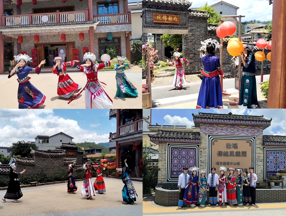 參觀結(jié)束后,隊員們迫不及待地穿上當(dāng)?shù)孛褡宸?,拍攝舞蹈視頻,讓非遺“活”起來。驕陽似火,隊員們汗流浹背,但誰都不肯停下跳舞和拍攝的腳步。大家都陶醉在火熱的民族風(fēng)情中,仿佛服飾上的每一針都是歷史,舞蹈中的每一拍都在對話山河。隨著一段段視頻拍攝發(fā)布,隊員們既為民族文化傳承注入了新的動力,也為隱于粵西群山中的福堂鎮(zhèn)迅速“圈粉”。