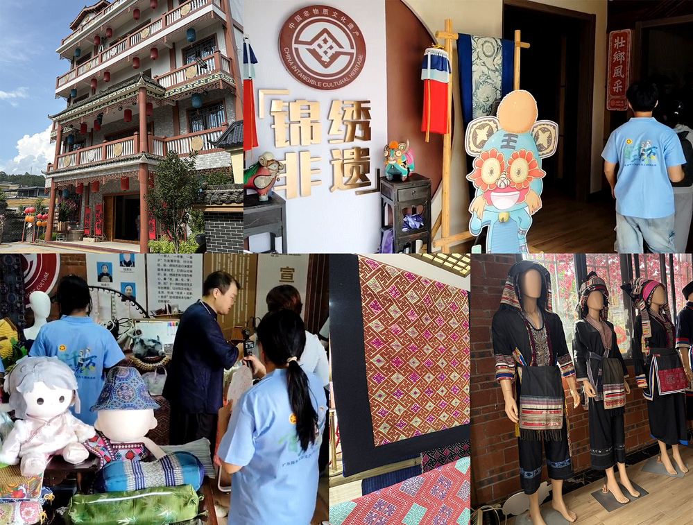團(tuán)隊到訪福堂鎮(zhèn)的第一站就是該鎮(zhèn)的文化名片——壯瑤風(fēng)采非遺園。非遺園以金龜村老宅為基礎(chǔ),建成系統(tǒng)展示壯族紡織繡染非遺技術(shù)、民族服飾、現(xiàn)代紡織藝術(shù)品的活態(tài)博物館,2024年開園后已接待游客超30萬人次。團(tuán)隊成員置身美輪美奐的錦繡織品中,聆聽著非遺傳承人冀老師介紹多種中藥材在染料中的應(yīng)用,解讀刺繡紋樣中隱藏的族群遷徙密碼與文化象征,內(nèi)心無比神往。