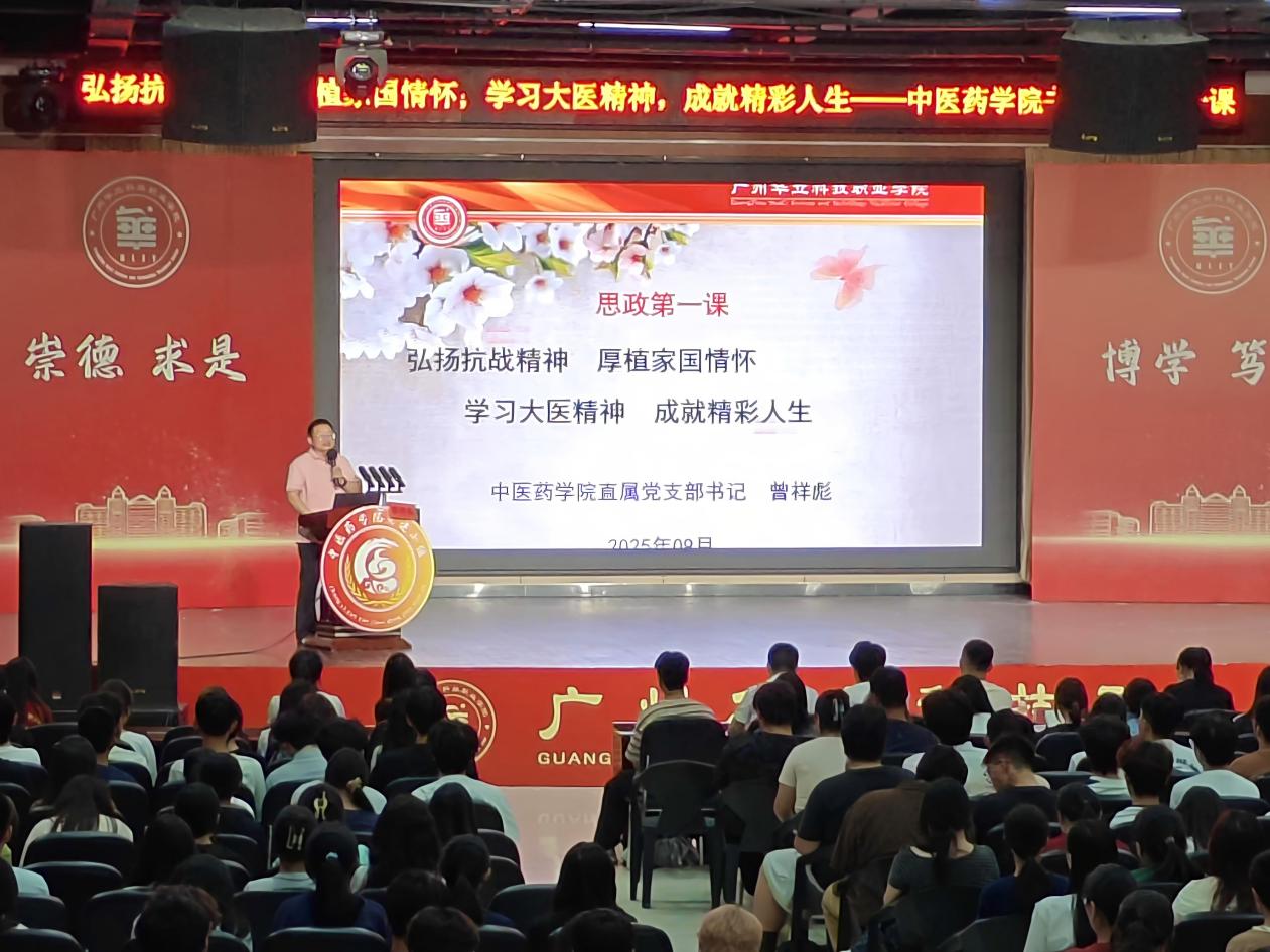 2025年9月8日晚,中醫(yī)藥學(xué)院副院長、直屬黨支部書記曾祥彪,以“弘揚抗戰(zhàn)精神,厚植家國情懷;學(xué)習(xí)大醫(yī)精神,成就精彩人生”為主題,為學(xué)院2025級新生講授了一堂思想深刻、內(nèi)涵豐富的思政第一課。同學(xué)們在莊重而熱烈的氛圍中不僅經(jīng)歷了一場思想深度的精神洗禮,還在課程的指引下系好大學(xué)的“第一??圩印薄?/span>