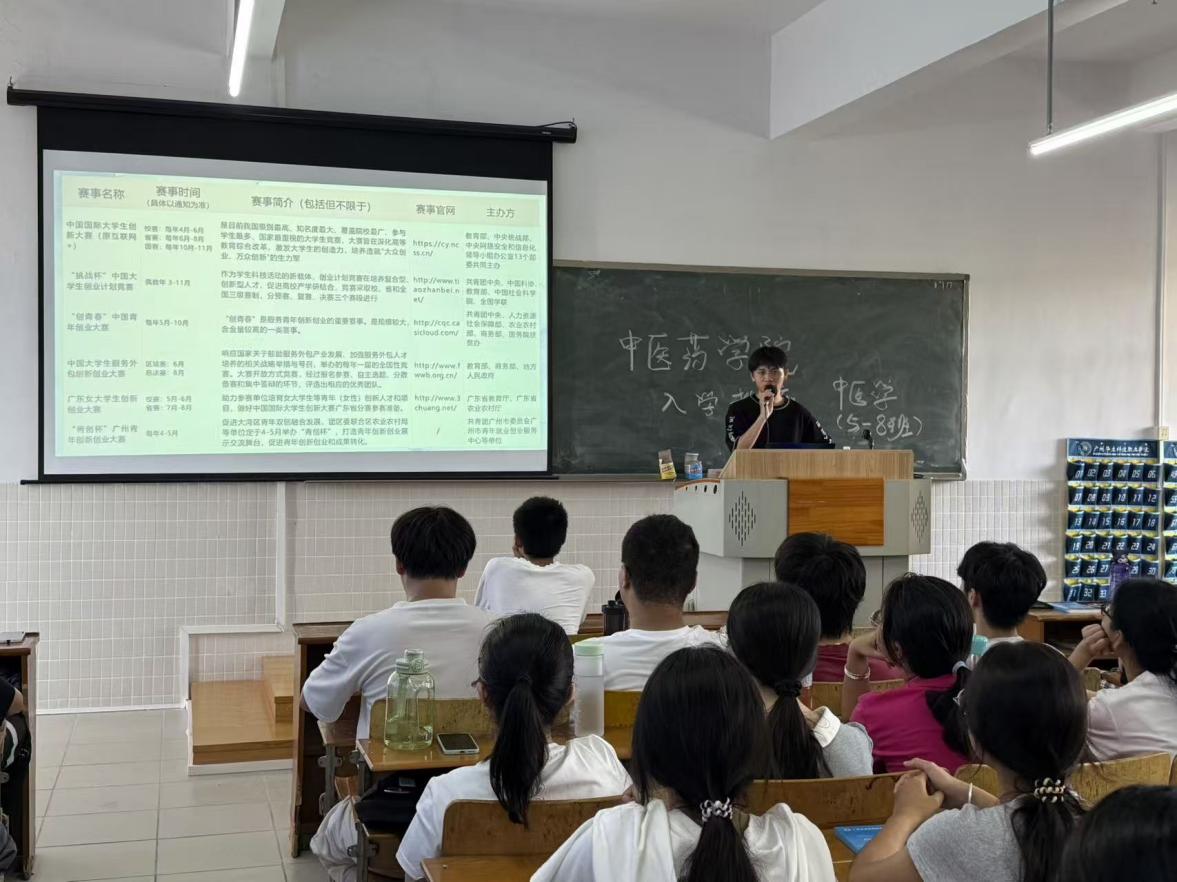2025年9月4日下午,云浮校區(qū)中醫(yī)藥學院在一教409召開2025級新生創(chuàng)新創(chuàng)業(yè)競賽宣講會,由溫貴城老師進行宣講。`
