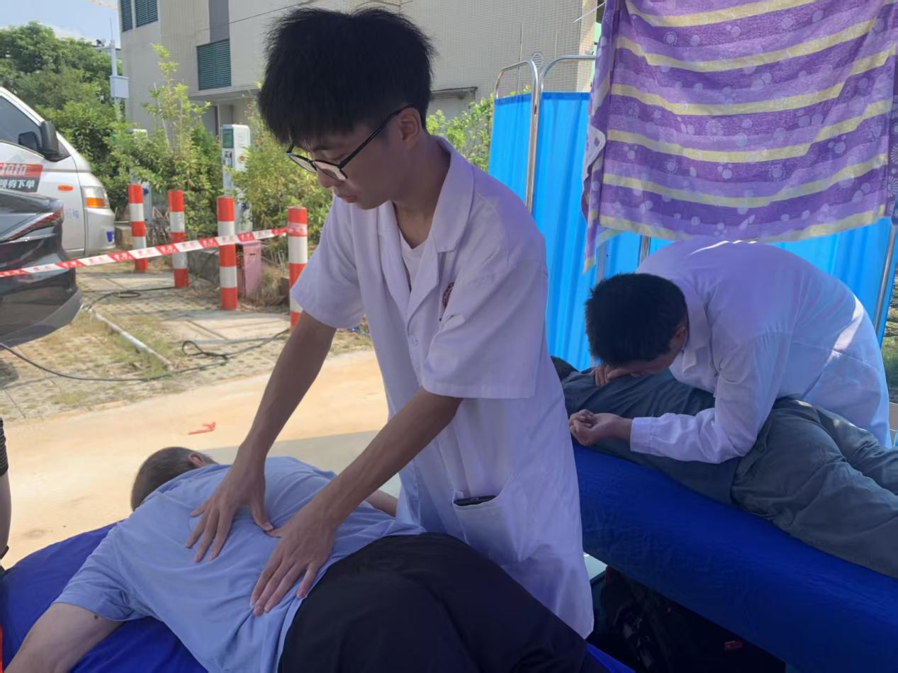 活動(dòng)現(xiàn)場(chǎng),醫(yī)療團(tuán)隊(duì)以飽滿的熱情與專業(yè)的態(tài)度投入服務(wù),迅速搭建起健康咨詢與理療服務(wù)專區(qū),吸引了眾多鄉(xiāng)鎮(zhèn)居民前來參與。潘菽弢博士憑借深厚的中醫(yī)理論功底與豐富的臨床經(jīng)驗(yàn),為居民們提供一對(duì)一健康咨詢服務(wù)。與此同時(shí),我院中醫(yī)藥應(yīng)用研究所講師團(tuán)與黨建小組的志愿者同學(xué)們充分發(fā)揮專業(yè)所長(zhǎng),為居民提供專業(yè)的推拿理療服務(wù)。面對(duì)患有頸肩腰腿痛的居民,志愿者們運(yùn)用嫻熟的推拿手法,精準(zhǔn)緩解肌肉緊張與疼痛,在服務(wù)過程中還向居民講解日常護(hù)腰、護(hù)頸的小技巧,幫助居民掌握自我保健方法。