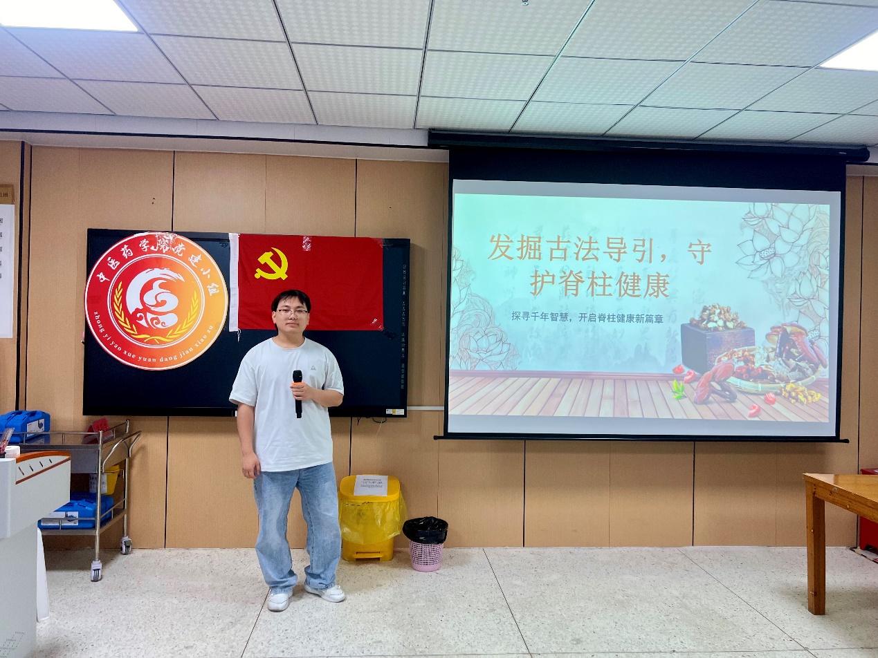2025年11月26日晚,由中醫(yī)藥學(xué)院直屬黨支部主辦,中醫(yī)藥學(xué)院黨建小組與中醫(yī)藥應(yīng)用研究所協(xié)辦的黨建引領(lǐng)“亦生亦師”項目化課程系列講座第六期——“發(fā)掘古法導(dǎo)引,守護(hù)脊柱健康”在西二104針灸推拿實訓(xùn)室成功舉行。本次活動吸引了中醫(yī)藥學(xué)院50名學(xué)生積極參與,旨在傳承中醫(yī)養(yǎng)生智慧,提升學(xué)生脊柱健康意識與自我保健能力。