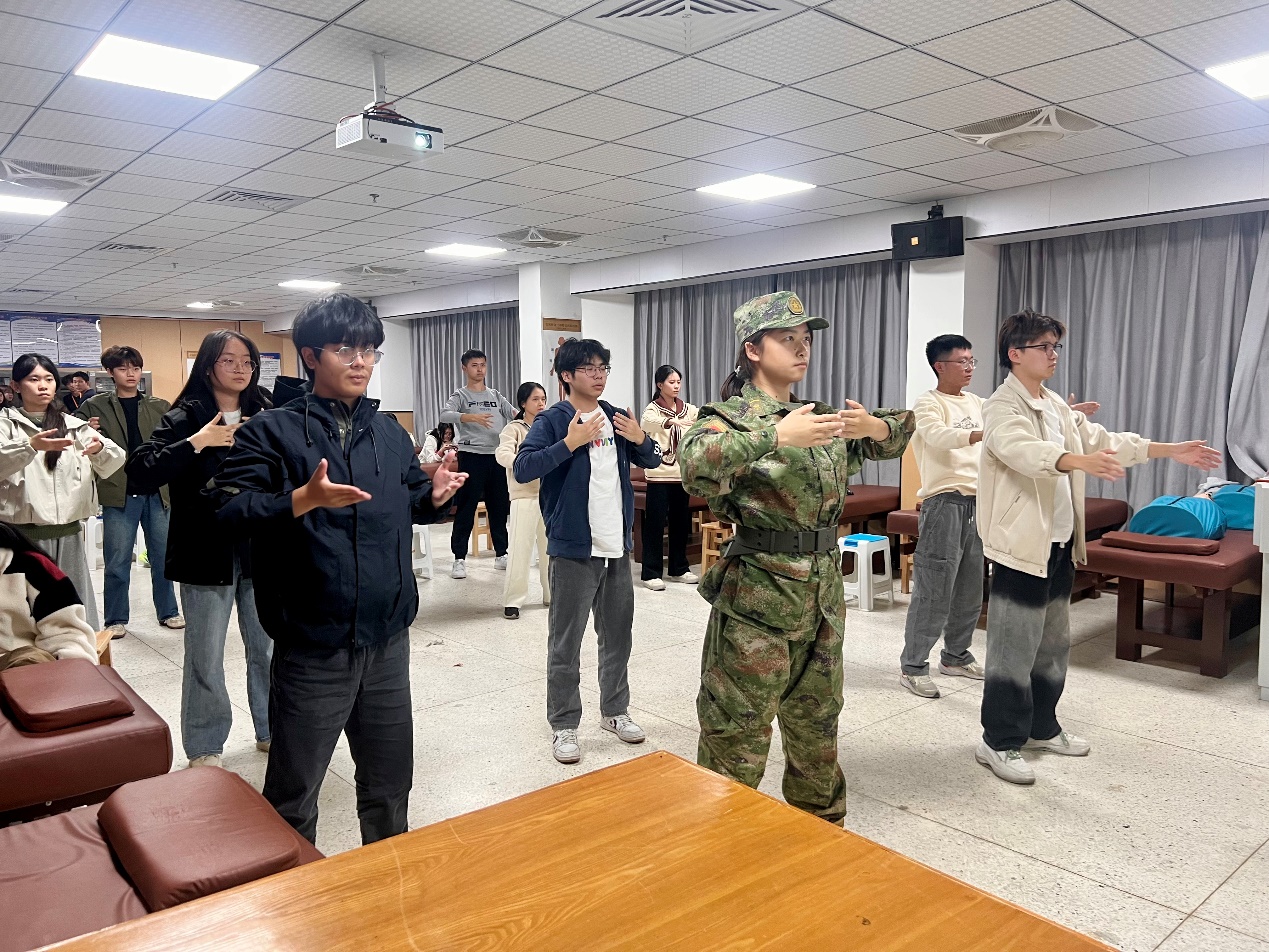 隨后,現(xiàn)場播放了由中醫(yī)藥應(yīng)用研究所講師團(tuán)精心錄制的導(dǎo)引動作教學(xué)視頻,系統(tǒng)展示了多個針對頸、胸、腰椎的經(jīng)典導(dǎo)引姿勢,包括八段錦中關(guān)于脊柱保健的精華招式,視頻詳細(xì)的要領(lǐng)講解,確保每個動作細(xì)節(jié)都能清晰呈現(xiàn)。在觀看過程中,同學(xué)們?nèi)褙炞?,這段教學(xué)視頻不僅再現(xiàn)了標(biāo)準(zhǔn)動作,將古老的導(dǎo)引術(shù)以現(xiàn)代化方式呈現(xiàn),為接下來的實操環(huán)節(jié)提供了直觀的參考依據(jù),讓學(xué)生們能夠更快地掌握動作要領(lǐng)。在講師和黨建小組工作人員的引導(dǎo)下,學(xué)生們分為若干小組,開展現(xiàn)場實操訓(xùn)練,大家互相糾正動作、講師團(tuán)成員巡回指導(dǎo),確保動作規(guī)范,不少同學(xué)表示“做完一套動作,肩頸輕松了許多”。